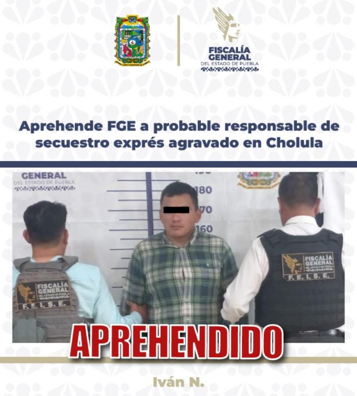 Como resultado de actos de investigación, la Fiscalía General del Estado de Puebla (FGE) cumplimentó una orden de aprehensión en contra de Iván N., de 33 años, por su probable responsabilidad en el delito de secuestro exprés agravado para cometer robo y extorsión, actos acontecidos en el municipio de San Pedro Cholula.
