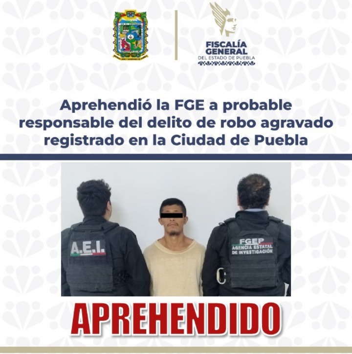 Aprehendió la FGE a probable responsable de robo agravado registrado en la Ciudad de Puebla.