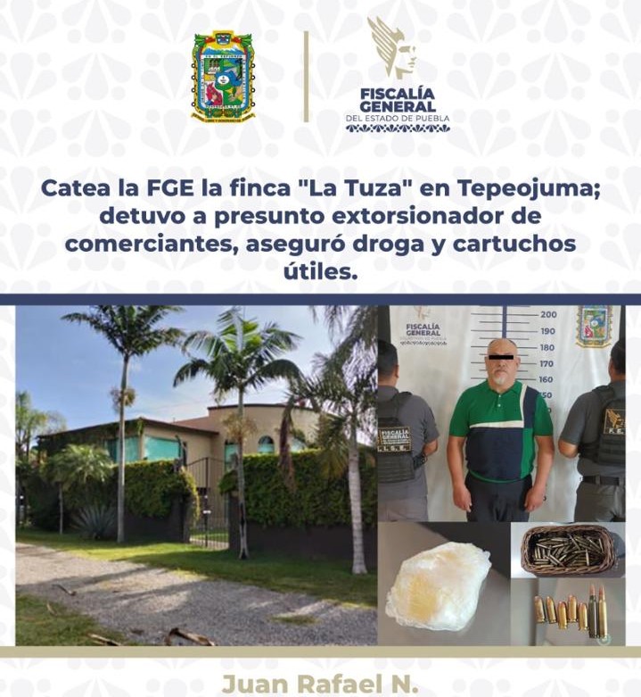 La Fiscalía General del Estado informa que como resultado de labores de inteligencia, análisis de la información y trabajo de campo, fue ejecutado un cateo en la finca «La Tuza», del municipio de Tepeojuma, lo que derivó en la detención en flagrancia de Juan Rafael N., presunto responsable de delitos relacionados con la extorsión a comerciantes, asimismo, se aseguró droga y cartuchos útiles.