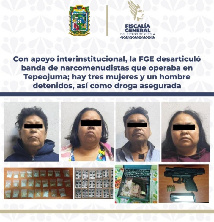 Con apoyo interinstitucional, la FGE desarticuló banda de narcomenudistas que operaba en Tepeojuma; hay tres mujeres y un hombre detenidos, así como droga asegurada