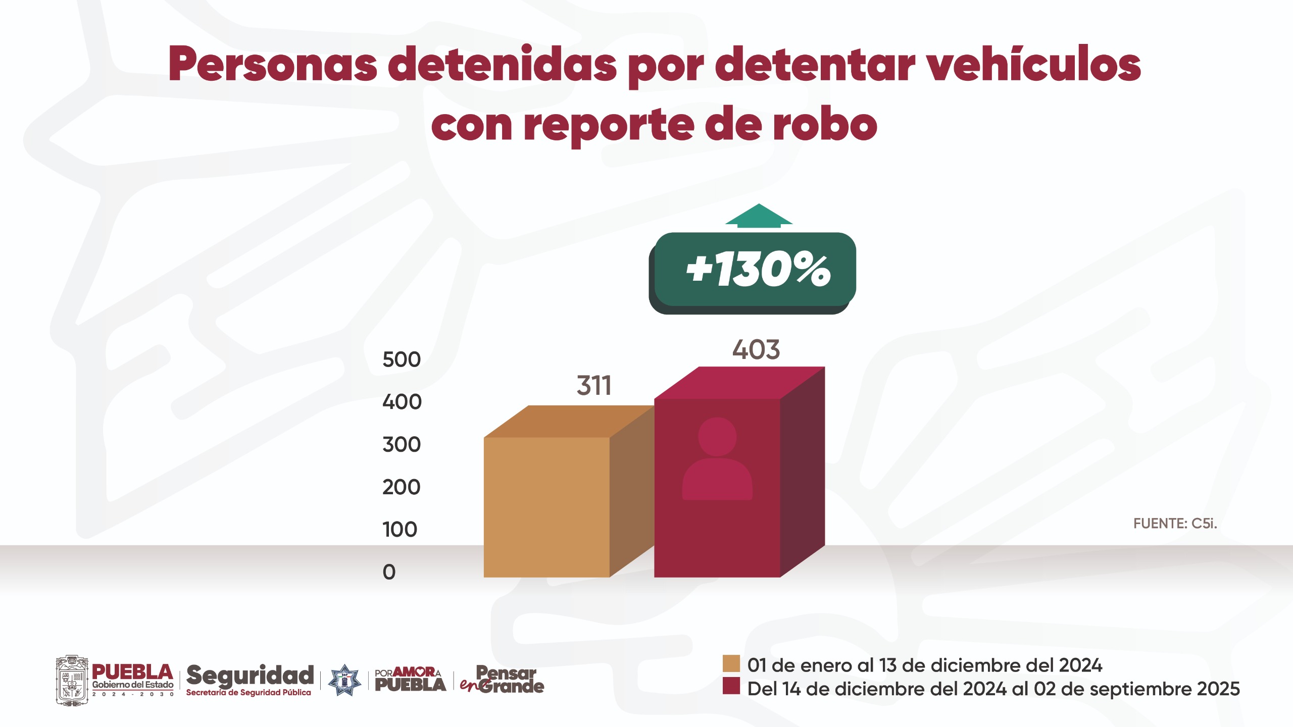 Resaltó que, del 14 de diciembre de 2024 al 2 de septiembre de 2025, derivado del trabajo conjunto entre la Secretaría de Seguridad Pública, Secretaría de Marina, Secretaría de la Defensa, Guardia Nacional y policías municipales, así como de las labores de inteligencia, fueron detenidas 403 personas por detentar vehículos robados, cifra que representa un 130 por ciento más al comparar los datos de 2024, año en el que se reportó la remisión de 311 personas ante el Agente del Ministerio Público.