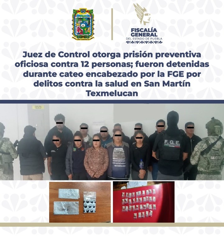 La Fiscalía General del Estado informa que el Juez de Control calificó de legal la detención y otorgó prisión preventiva oficiosa en contra de 12 personas (5 mujeres y 7 hombres), por delitos contra la salud, tras la ejecución de un cateo en cuatro bares del municipio de San Martín Texmelucan, en cumplimiento a mandatos judiciales.