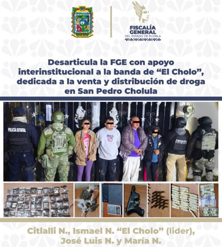 Como resultado de labores de inteligencia y trabajo de campo, la Fiscalía General del Estado (FGE), con apoyo interinstitucional, desarticuló la banda conocida como “El Cholo”, tras la detención de su presunto líder y tres integrantes más, quienes estarían relacionados con la venta y distribución de droga en el municipio de San Pedro Cholula; asimismo, se aseguró droga y un inmueble utilizado como punto de operación.