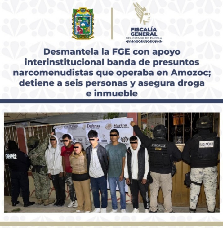 Como resultado de un operativo encabezado por la Fiscalía General del Estado de Puebla (FGE), con apoyo de la Secretaría de la Defensa Nacional (DEFENSA), la Guardia Nacional (GN) y la Secretaría de Seguridad Pública Estatal (SSPE), se logró desmantelar a una presunta banda de narcomenudistas que operaba en el municipio de Amozoc, Puebla. Durante cateo fueron detenidas seis personas y se aseguró droga.