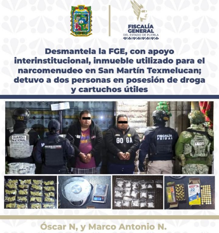 La Fiscalía General del Estado implementó, con apoyo interinstitucional, acciones operativas en San Martín Texmelucan, logrando desmantelar un inmueble utilizado para actividades de narcomenudeo; además, detuvo en el lugar a Óscar N. y Marco Antonio N., presuntamente en posesión de diversas dosis de estupefacientes y cartuchos útiles.