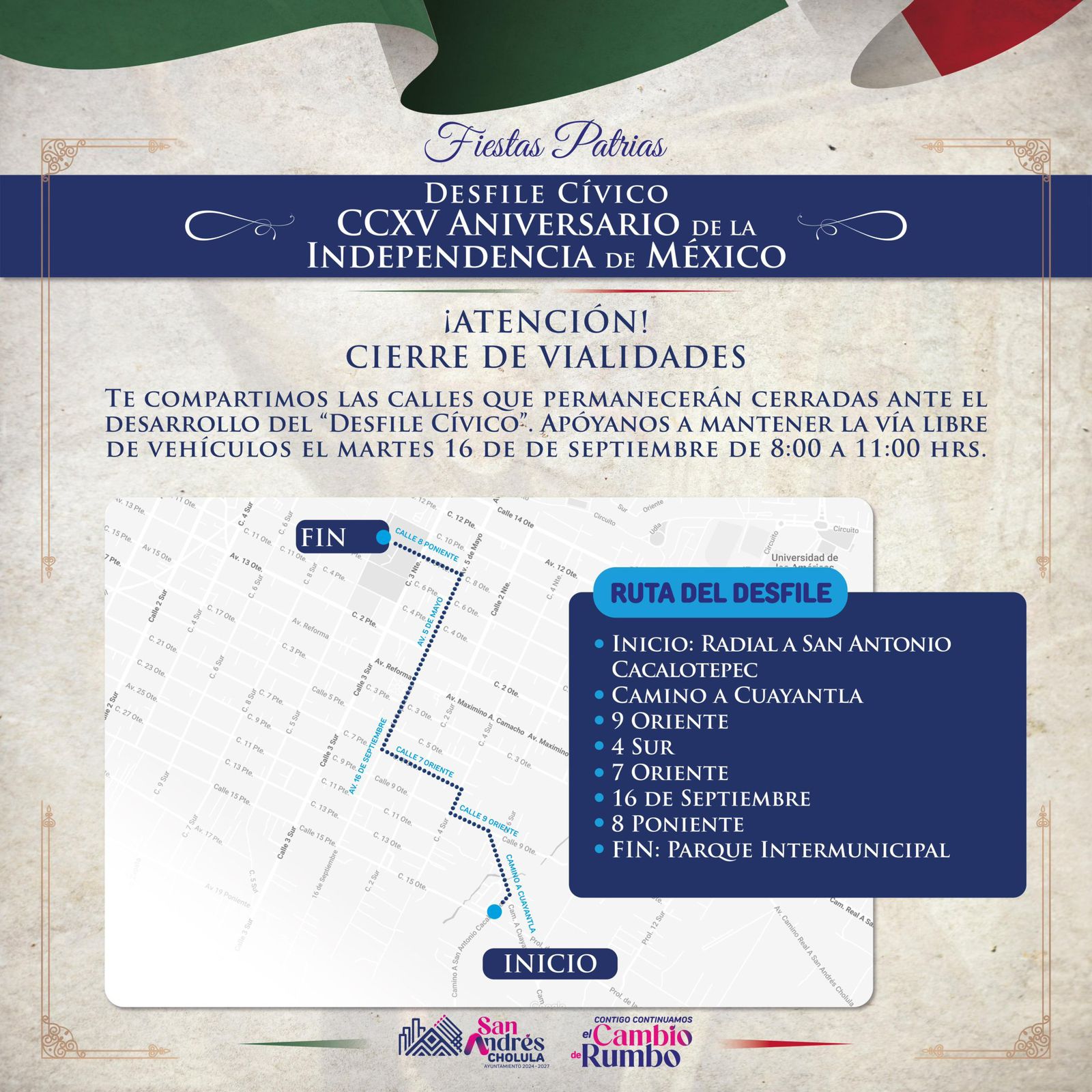 Con respecto al desfile cívico del 16 de septiembre, se informa que los contingentes comenzarán su trayecto a las 09:00 horas sobre la Radial a San Antonio Cacalotepec, posteriormente doblarán a la izquierda sobre Camino a Cuayantla y darán vuelta a la derecha sobre la 4 Sur, donde girarán a la izquierda en la 7 Oriente y en la calle 16 de septiembre se girará a la derecha para incorporarse en la calle de la 8 Poniente hasta llegar al Parque Intermunicipal.
