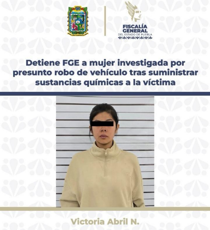 La Fiscalía General del Estado de Puebla dio cumplimiento a una orden de aprehensión en contra de Victoria Abril N., por su presunta responsabilidad en el delito de robo de vehículo agravado.