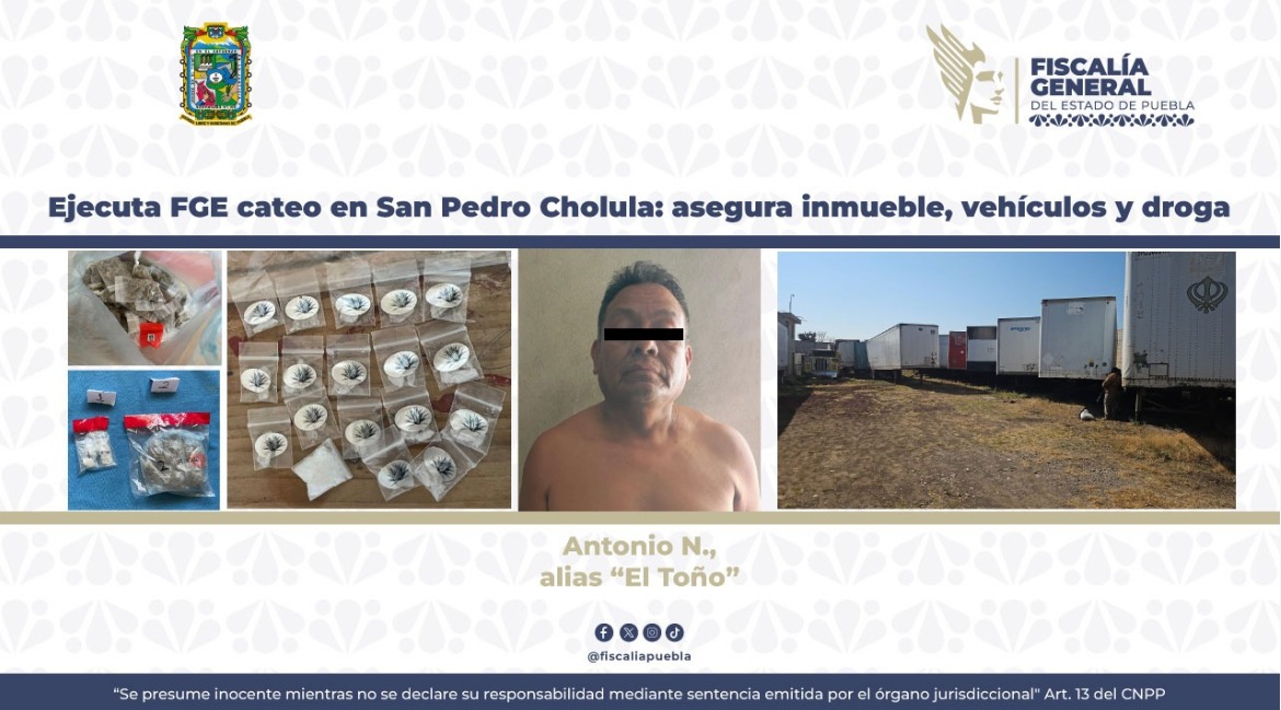 Como resultado de actos de investigación, la Fiscalía General del Estado de Puebla (FGE), ejecutó una orden de cateo en un inmueble ubicado en Santa María Zacatepec, en el municipio de San Pedro Cholula, por delitos contra la salud en su modalidad de narcomenudeo.
