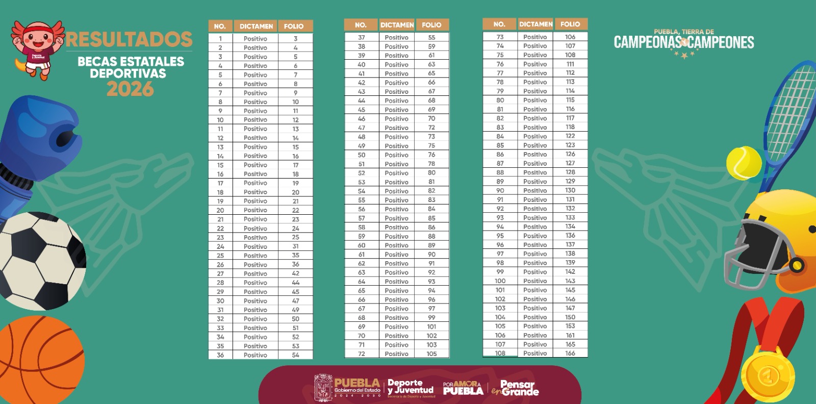 Como parte del apoyo que brinda el gobernador Alejandro Armenta Mier a las y los deportistas poblanos para su desarrollo integral, la Secretaría de Deporte y Juventud da a conocer los resultados de las y los aspirantes a becas deportivas 2026.