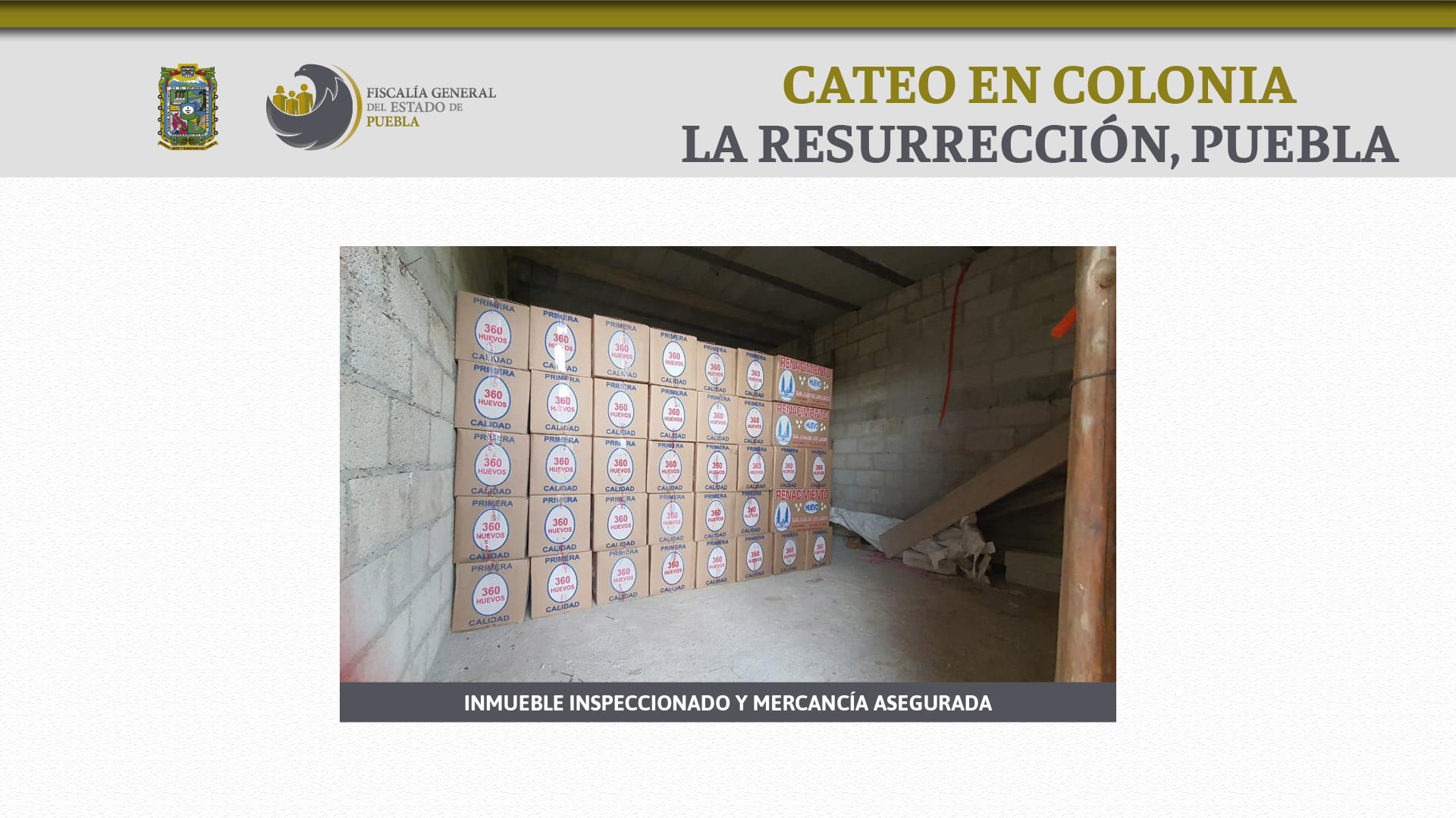 Por el delito de robo de vehículo con mercancía, la Fiscalía General del Estado de Puebla cateó un inmueble en la capital poblana en donde había 385 cajas de huevo.