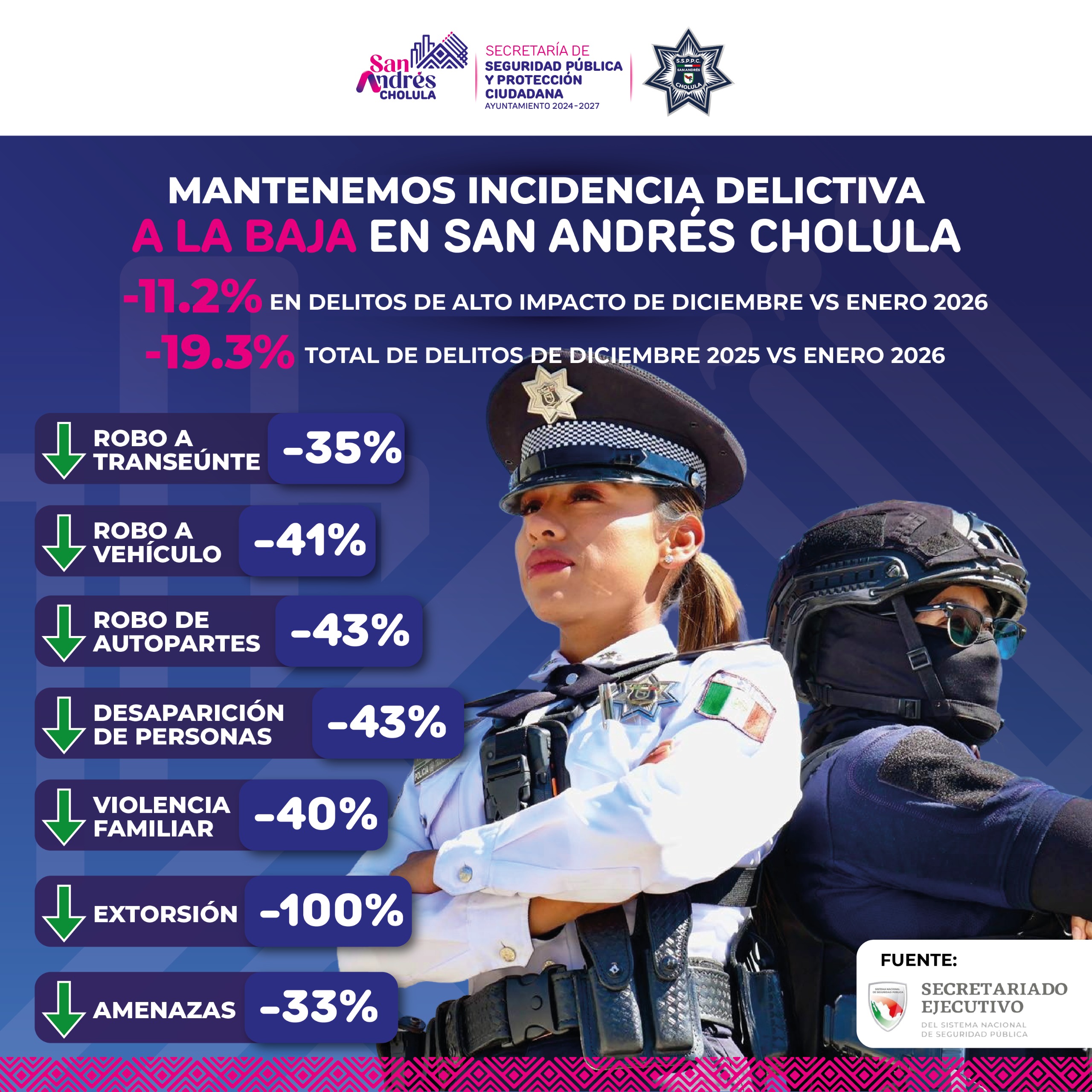 Entre los delitos con mayor reducción destacan el robo de autopartes y la desaparición de personas, ambos con un descenso del 43 por ciento; el robo de vehículo con 41 por ciento; la violencia familiar con 40 por ciento; el robo a transeúnte con 35 por ciento; las amenazas con 33 por ciento y la extorsión, que presentó una reducción del 100 por ciento.