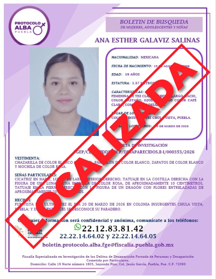 La Fiscalía General del Estado de Puebla informa que, a través de la Fiscalía Especializada en Investigación de los Delitos de Desaparición Forzada de Personas y Desaparición Cometida por Particulares, se logró la localización de Ana Esther Galaviz Salinas, de 19 años de edad.