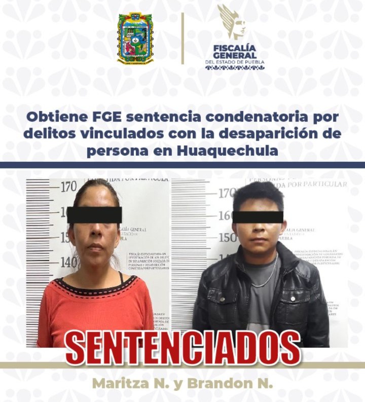 Como resultado del desahogo del proceso penal, la Fiscalía General del Estado de Puebla (FGE) obtuvo sentencia condenatoria contra Maritza N. y Brandon N., por su responsabilidad en delitos vinculados con la desaparición de persona, acto ocurrido en el municipio de Huaquechula.