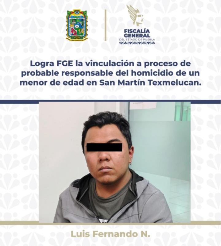 La Fiscalía General del Estado de Puebla informa que, como resultado del trabajo ministerial se obtuvo la vinculación a proceso de Luis Fernando N., de 27 años de edad, por su probable responsabilidad en la comisión del delito de homicidio calificado en agravio de un menor de edad, hijo de su pareja sentimental.