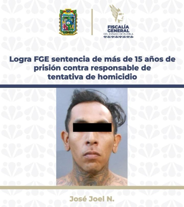 La Fiscalía General del Estado de Puebla obtuvo una sentencia de 15 años, 10 meses de prisión en contra de José Joel N., declarado penalmente responsable del delito de homicidio calificado en grado de tentativa, en agravio de dos personas en la ciudad de Puebla.