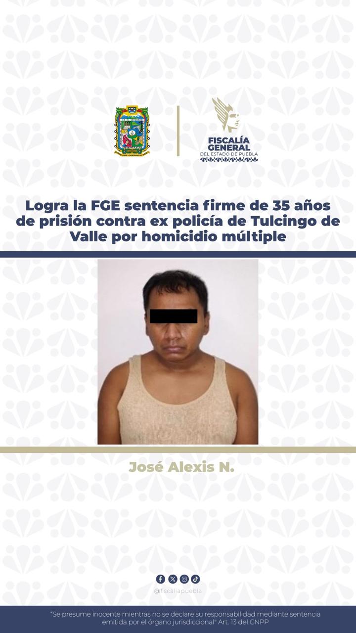 La Fiscalía General del Estado logró que quedara firme la sentencia de 35 años de prisión en contra de José Alexis N., ex policía municipal de Tulcingo de Valle, tras acreditarse su plena responsabilidad penal en el delito de homicidio calificado en agravio de cuatro personas.