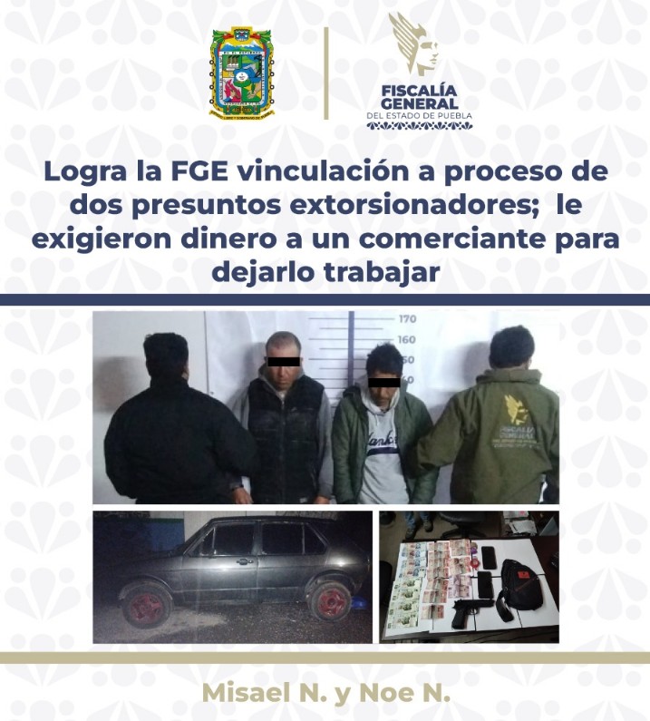 Con base en diversos elementos de prueba, la Fiscalía General del Estado de Puebla obtuvo de la autoridad judicial, la vinculación a proceso de Misael N., de 30 años y Noé N., de 40 años de edad, por su presunta responsabilidad en el delito de extorsión, ocurrido en el municipio de Libres, Puebla.
