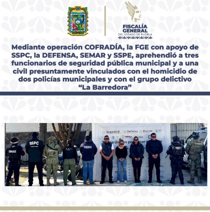 Derivado de la sólida coordinación interinstitucional, autoridades de los tres órdenes de gobierno desplegaron la Operación COFRADÍA, encabezada por la Fiscalía General del Estado de Puebla (FGE), con el apoyo de la Secretaría de Seguridad y Protección Ciudadana (SSPC), la Secretaría de la Defensa Nacional (DEFENSA), la Secretaría de Marina (SEMAR) y la Secretaría de Seguridad Pública Estatal (SSPE), logrando el cumplimiento de órdenes de aprehensión en contra de Hugo N., Atanacio N. y Rocío N., servidores públicos de la Secretaría de Seguridad Ciudadana de Puebla, así como de otra persona de nombre Ana Belem N., presuntamente vinculados con el homicidio de dos policías municipales y con el grupo delictivo “La Barredora”.