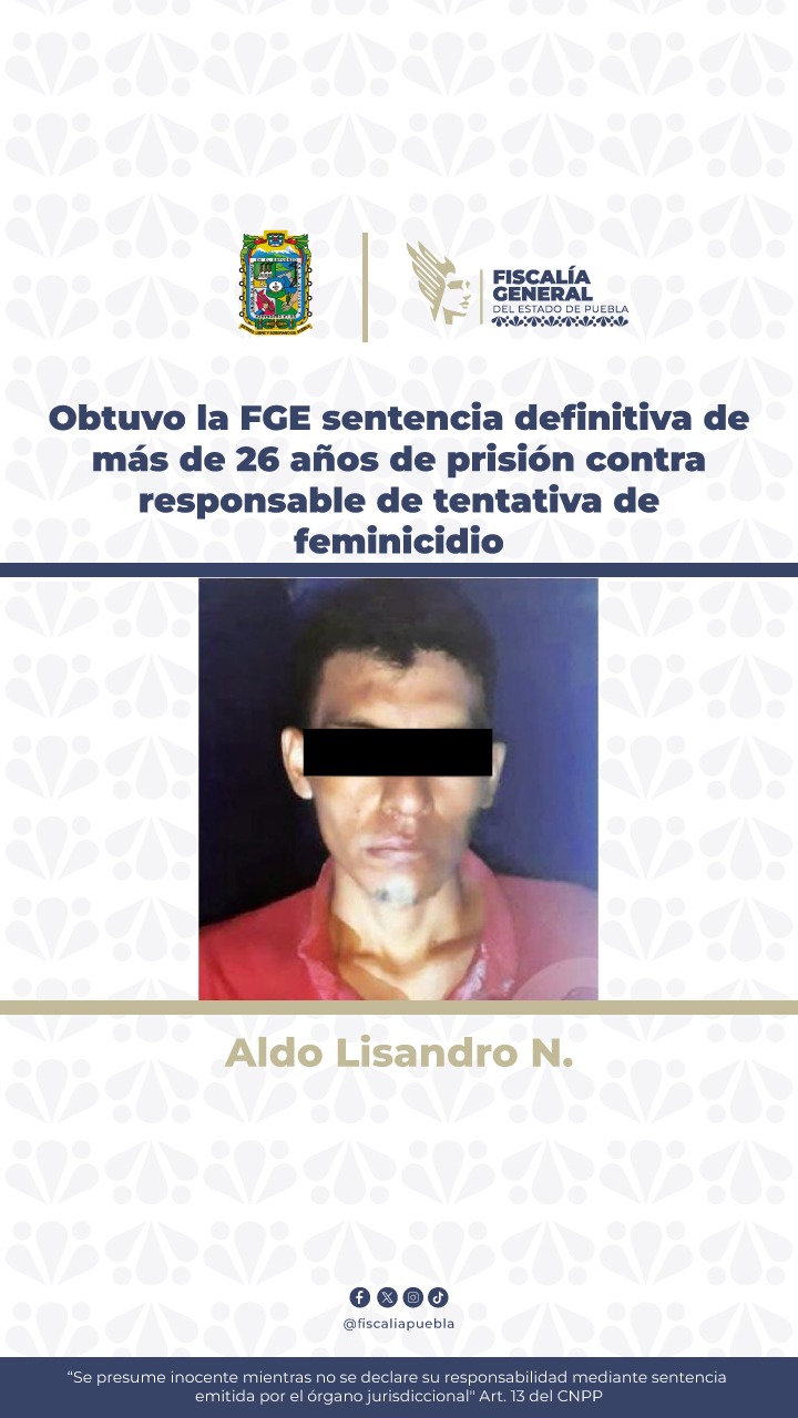 La Fiscalía General del Estado obtuvo sentencia definitiva de 26 años, 8 meses de prisión, en contra de Aldo Lisandro N., penalmente responsable del delito de tentativa de feminicidio en agravio de una mujer adulta mayor.
