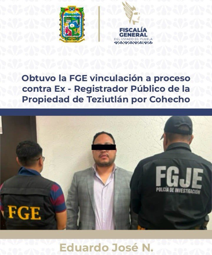 La Fiscalía General del Estado de Puebla obtuvo la vinculación a proceso en contra de Eduardo José N., ex Registrador Público de la Propiedad de Teziutlán, por su probable responsabilidad en el delito de Cohecho.