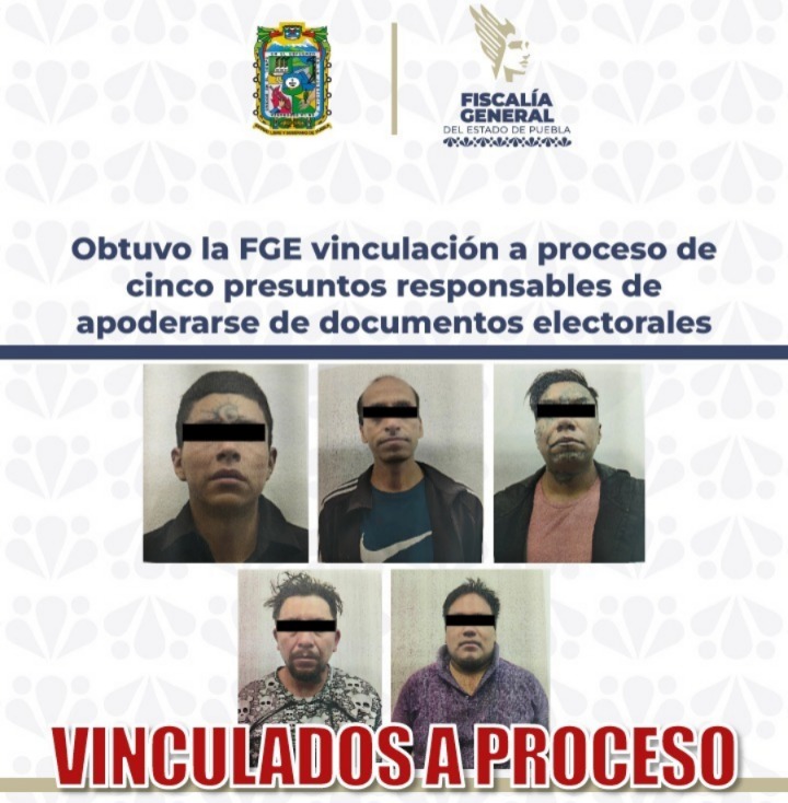 Con base en las pruebas presentadas por la Fiscalía General del Estado, se logró la vinculación a proceso de Jesús N., José Luis N., Miguel Alejandro N., Carlos N y Emilio N., por su presunta participación en el delito de apoderamiento de documentos públicos electorales, en el municipio de Tlapanalá.
