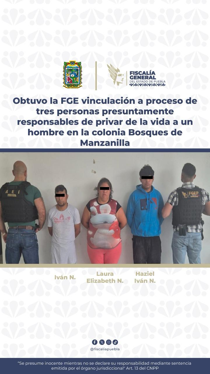 La Fiscalía General del Estado de Puebla obtuvo la vinculación a proceso de Laura Elizabeth N., Iván N. y Haziel Iván N., por su probable responsabilidad en la comisión del delito de homicidio calificado, en agravio de un hombre en la ciudad de Puebla.