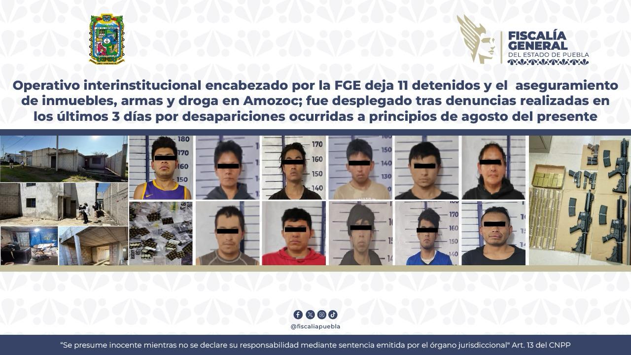 La Fiscalía General del Estado de Puebla informa que como resultado de un operativo interinstitucional realizado por tierra y aire en el municipio de Amozoc, orientado a la localización de personas reportadas como desaparecidas, se logró la detención de 11 personas, el aseguramiento de inmuebles y diversos indicios relevantes, incluyendo armas de fuego, narcóticos y un vehículo. El dispositivo fue desplegado tras denuncias realizadas en los últimos tres días ante la FGE, correspondientes a desapariciones ocurridas a principios de agosto del presente.