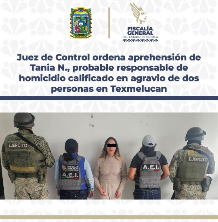 La Fiscalía General del Estado informa que en cumplimiento a un mandamiento del Juez de Control, fue aprehendida al salir de una audiencia en Casa de Justicia de Puebla, Tania N., de 33 años de edad, como probable responsable del delito de homicidio calificado, en agravio de dos personas en el municipio de San Martín Texmelucan.