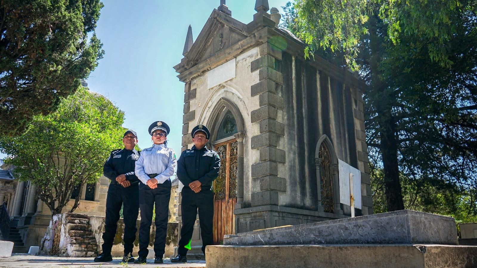 Las y los elementos realizan labores de vigilancia, recorridos pie-tierra y patrullajes preventivos, además de brindar orientación y apoyo en los accesos y alrededores de los camposantos.