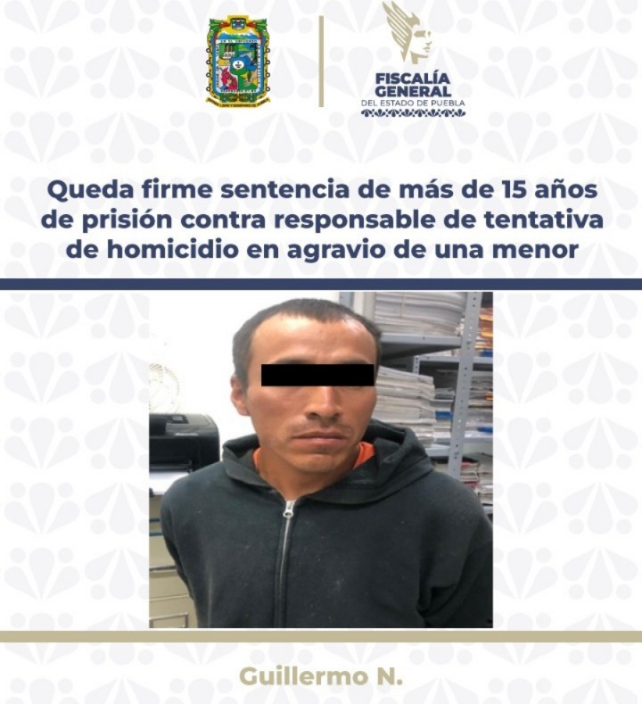 La Fiscalía General del Estado logró mediante la aportación de diversos datos de prueba, que quedara firme la sentencia de más de 15 años de prisión, en contra de Guillermo N., penalmente responsable del delito de homicidio en grado de tentativa, en agravio de una menor de edad, ocurrido en la ciudad de Puebla.