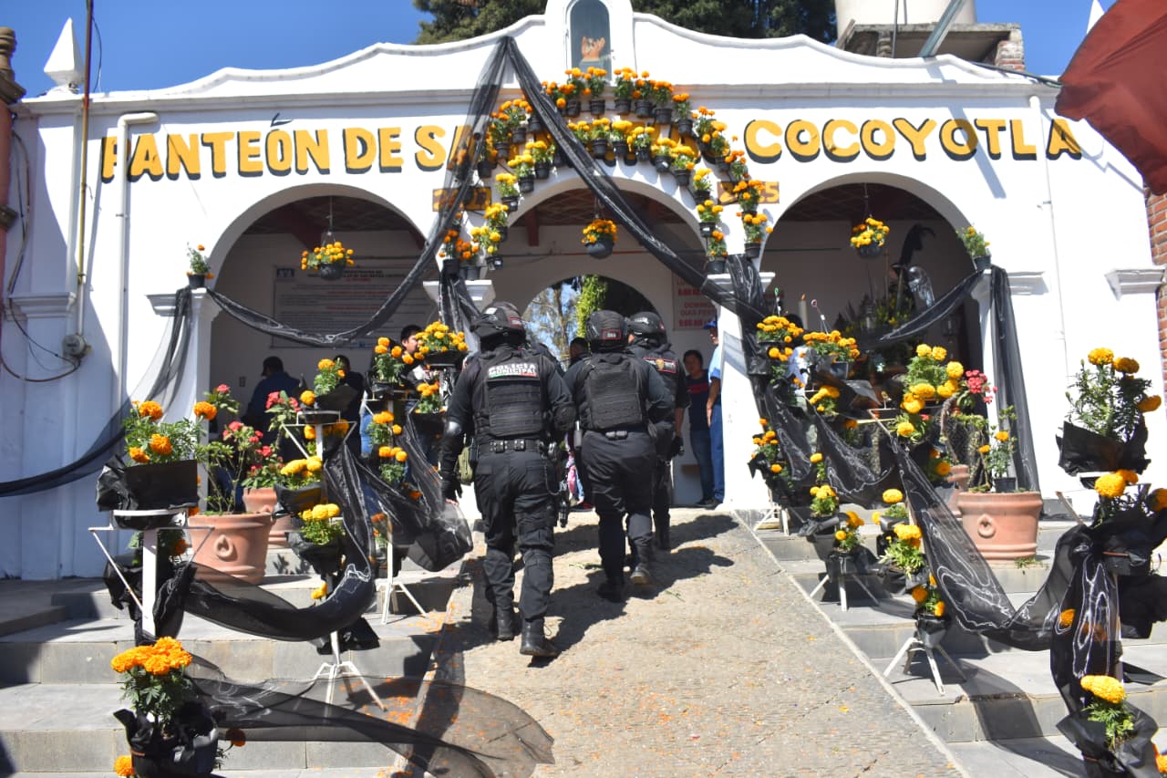Con el objetivo de preservar las tradiciones y garantizar la seguridad de las y los visitantes, la Secretaría de Seguridad Ciudadana (SSC Cholula) llevó a cabo patrullajes preventivos y recorridos pie-tierra en los panteones ubicados en los barrios de Jesús y La Magdalena, así como en las juntas auxiliares de Santiago Momoxpan, San Matías Cocoyotla, San Diego Cuachayotla, San Sebastián Tepalcatepec, San Juan Tlautla, San Cristóbal Tepontla, San Agustín Calvario, San Gregorio Zacapechpan, Santa María Acuexcomac y San Francisco Cuapan, con el propósito de mantener el orden y brindar protección a las familias que acudieron a rendir homenaje a sus seres queridos.