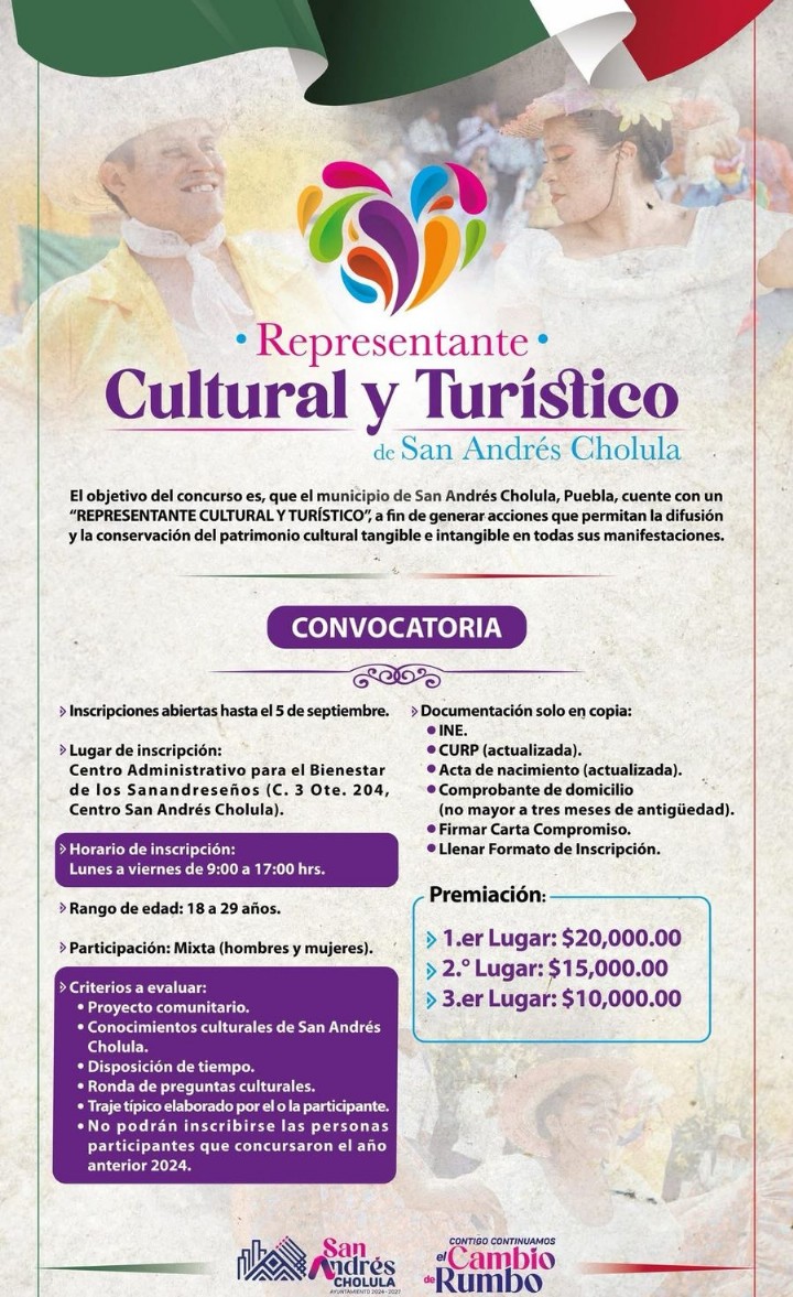 Con el objetivo de generar acciones para la conservación del patrimonio cultural, el Gobierno Municipal, encabezado por la presidenta Lupita Cuautle Torres, invita a participar como Representante Cultural y Turístico de San Andrés Cholula.