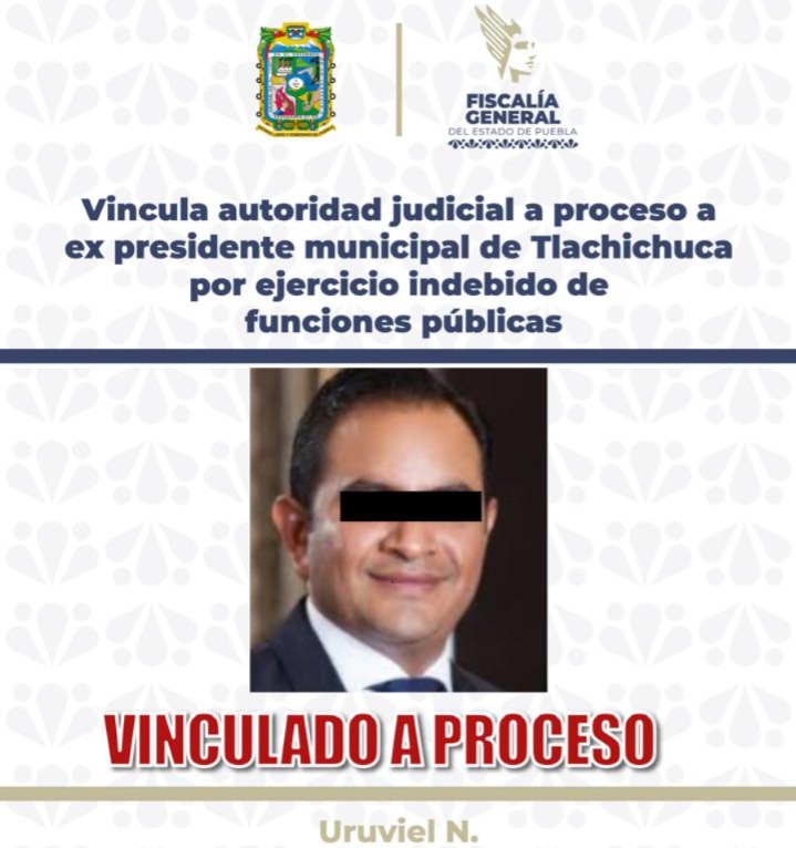 Como resultado de los actos de investigación, la Fiscalía General del Estado de Puebla (FGE) obtuvo la vinculación a proceso de Uruviel N., ex presidente municipal de Tlachichuca, por su probable responsabilidad en el delito de ejercicio indebido de funciones públicas, derivado de hechos registrados en dicho municipio.