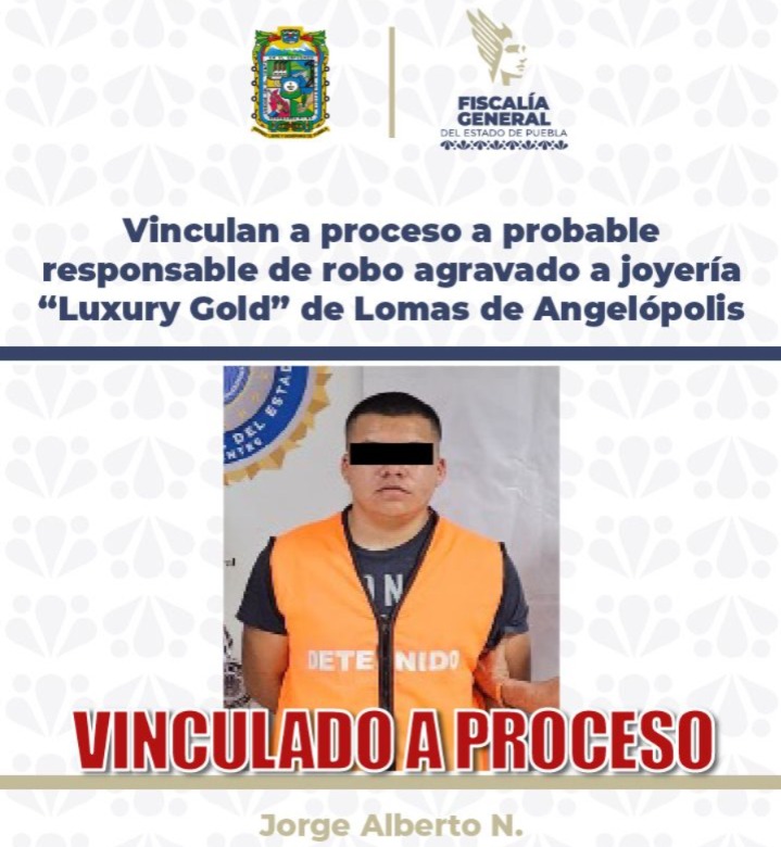 Como resultado de los actos de investigación, la Fiscalía General del Estado de Puebla (FGE) obtuvo la vinculación a proceso de Jorge Alberto N., de 25 años, por su probable responsabilidad en el delito de robo agravado, por hechos ocurridos en el municipio de San Andrés Cholula.